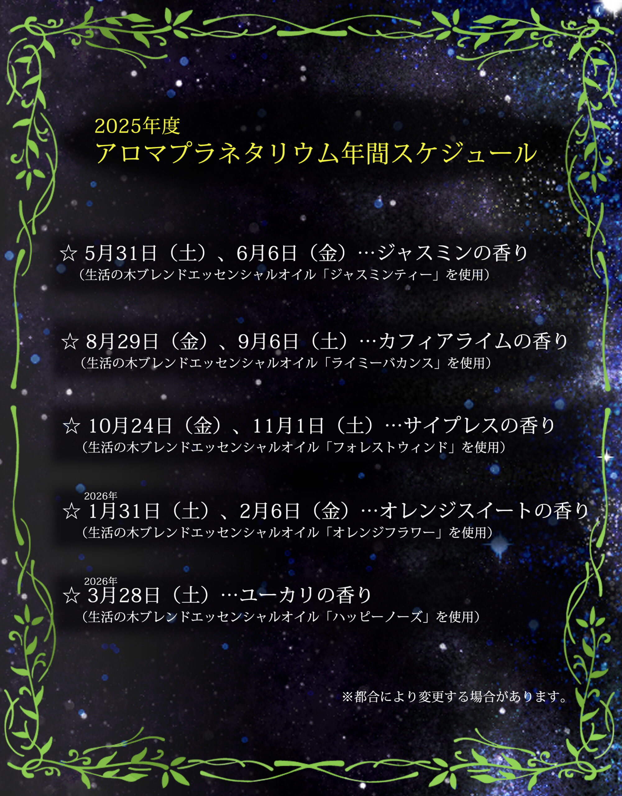 アロマプラネタリウムの年間スケジュール及び香りはこちらから